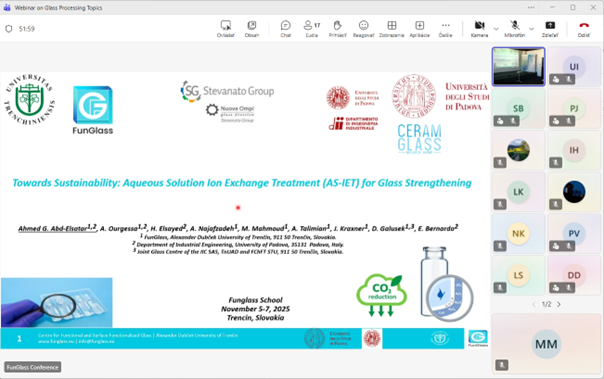 The webinar featured a series of short, targeted presentations delivered by our FunGlass colleagues from the Glass Processing Department. Each presentation focused on a specific aspect of glass research or processing, offering participants an overview of current developments, methodological approaches, and emerging challenges within the field.